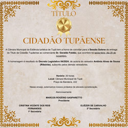 Sexta-feira, dia 29, ocorre a entrega do Título de Cidadão Tupãense ao comerciante e empresário Geraldo Faldão. Nascido em Quatá, Geraldo Faldão começou sua trajetória vendendo roupas de porta em porta de bicicleta, e hoje possui várias lojas em Tupã, gerando diretamente mais de 100 postos de trabalho na cidade. A homenagem é de autoria do vereador Antonio Alves de Sousa, “Ribeirão”.